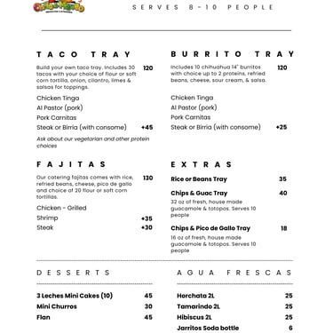 Fiesta Pack is our non-catered service. We prepare your delicious food, package it and then deliver to you.